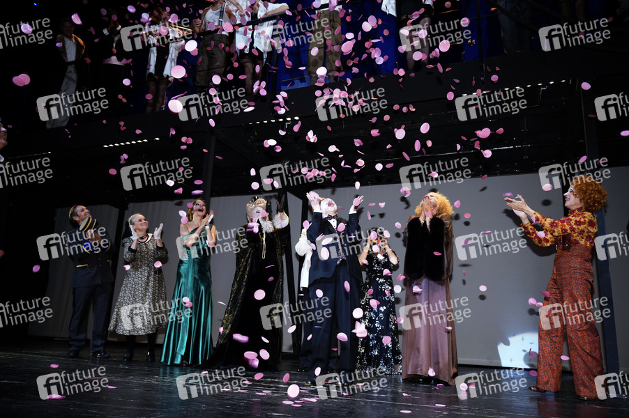 Katharina Thalbach und Ensemble-Mitglieder bei der Verleihung des Publikumspreises Goldener Vorhang an Katharina Thalbach nach der Vorstellung des Theaterstücks 'Mord im Orient-Expess' in der Komödie am Kurfürstendamm im Schiller Theater. Berlin, 11.09.2022
