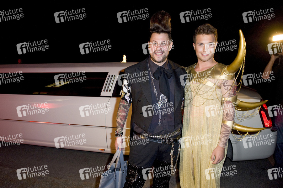 Matthias Maus und Maxim Grund beim Kunstevent zum offiziellen Verkaufsstart der Kollektion 'Glööckler Art by Borelly' mit einer Installation der Berliner Mauer und zu Kunstobjekten stilisierten Panzern im Schloss Friedrichsfelde. Berlin, 23.10.2013