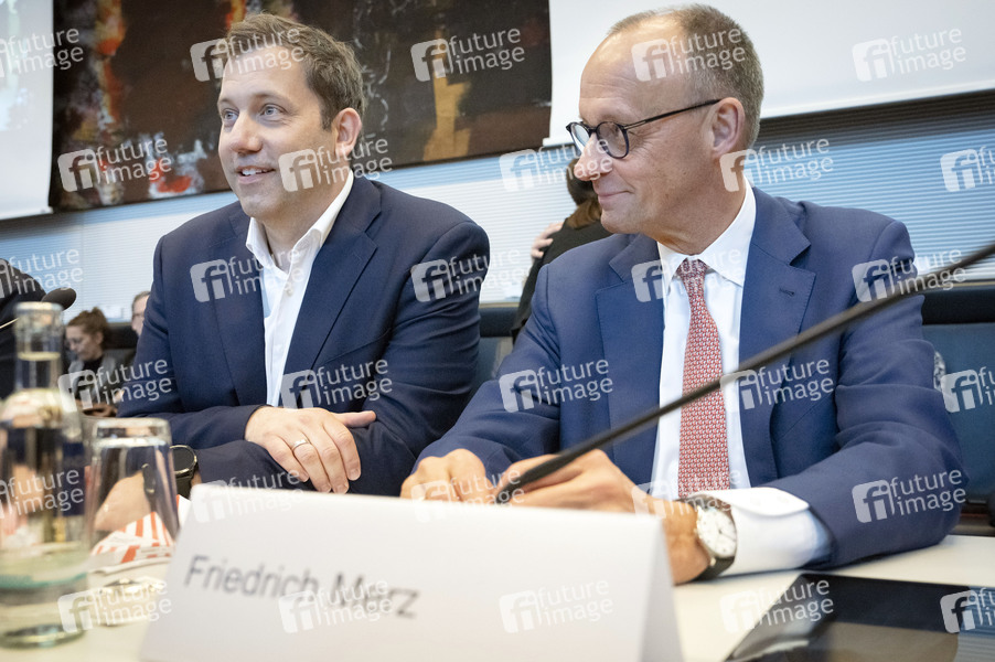 Lars Klingbeil und Friedrich Merz bei der Fraktionssitzung der SPD-Bundestagsfraktion im Reichstagsgebäude. Berlin, 05.05.2025