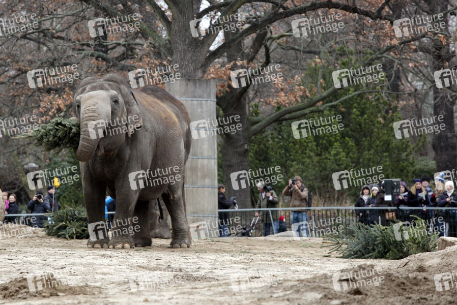 Vom Verkauf übrig gebliebene Weihnachtsbäume werden im Zoo an Elefanten verfüttert, Berlin