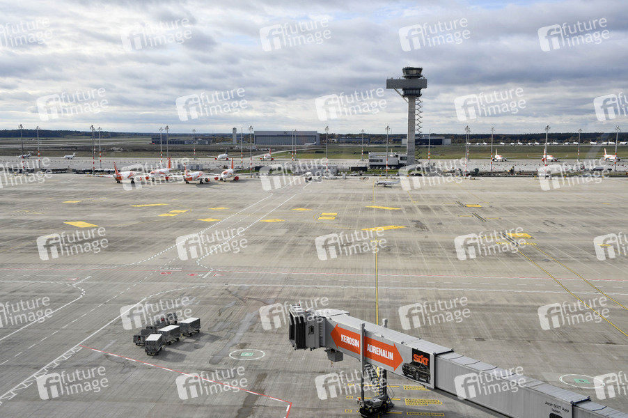 Blick von der Besucherterrasse beim Rundgang durch den öffentlichen Bereich des Terminals 1 mit Check-in-Halle und Besucherterrasse auf dem Flughafen Berlin Brandenburg. Schönefeld, 28.10.2020