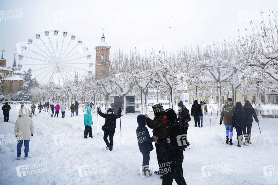 Plaza de Cervantes - Das Sturmtief Filomena sorgt in der Region Madrid und anderen Teilen Spaniens mit starken Schneefällen für Chaos. Die Hauptstadt Madrid wurde durch historisch heftigen Schneefall lahmgelegt. Seit 50 Jahren hat es nicht so geschneit. Der Verkehr ist in weiten Teilen des Landes zusammengebrochen. Alcalá de Henares, 09.01.2021