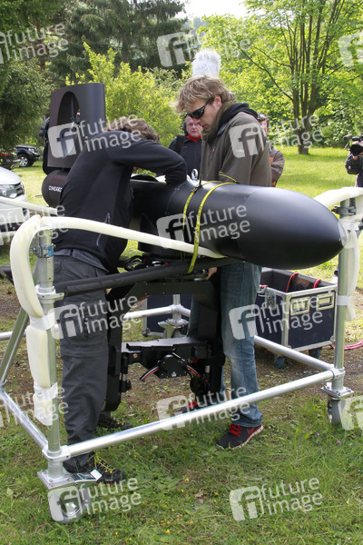 Bei den Dreharbeiten zum Kinofilm 'Schlussmacher' an der Edertalsperre am Edersee. Ein spezielle Kamerahalterung für Hubschrauberaufnahmen wird vorbereitet.