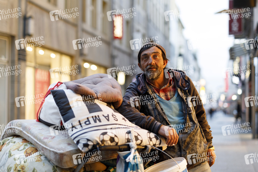 Ein Obdachloser aus Rumänien mit seinem Hab und Gut auf der Hohen Straße. Köln, 08.07.2019