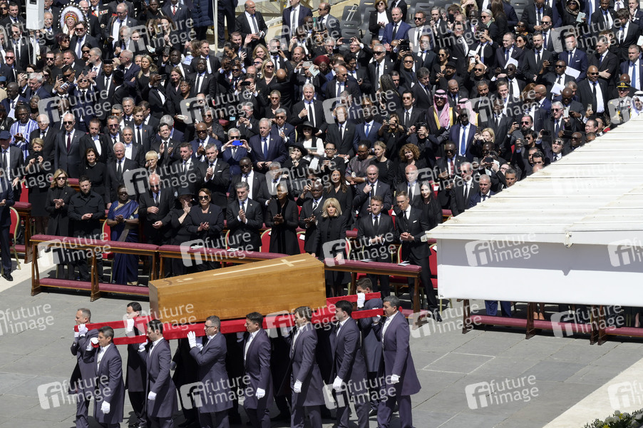 Der Sarg bei der Trauermesse für den verstorbenen Papst Franziskus auf dem Petersplatz. Vatikanstadt, 26.04.2025