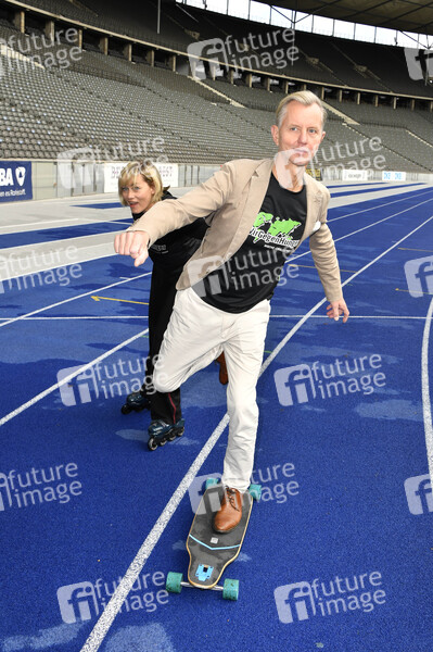 Max Raabe und Gesine Cukrowski beim Fototermin zur sportichen '#WocheChallenge' im Olympiastation Berlin. Unter dem Motto 'Wir können was bewegen!' ruft die Welthungerhilfe zu dieser Challenge auf und bittet um Spenden für eine Welt ohne Hunger. Berlin, 09.10.2020