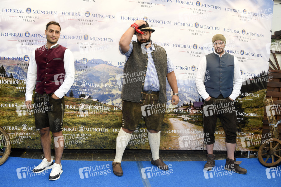 Timur Ülker, Faisal Kawusi und Patrick Heinrich beim Fassanstich bei der 9. Hofbräu Berlin Wiesn im Hofbräu Wirtshaus Berlin. Berlin, 19.09.2020