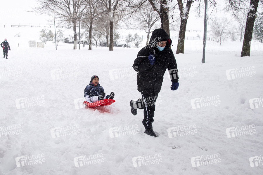 Das Sturmtief Filomena sorgt in der Region Madrid und anderen Teilen Spaniens mit starken Schneefällen für Chaos. Die Hauptstadt Madrid wurde durch historisch heftigen Schneefall lahmgelegt. Seit 50 Jahren hat es nicht so geschneit. Der Verkehr ist in weiten Teilen des Landes zusammengebrochen. Torrejón de Ardoz, 09.01.2021