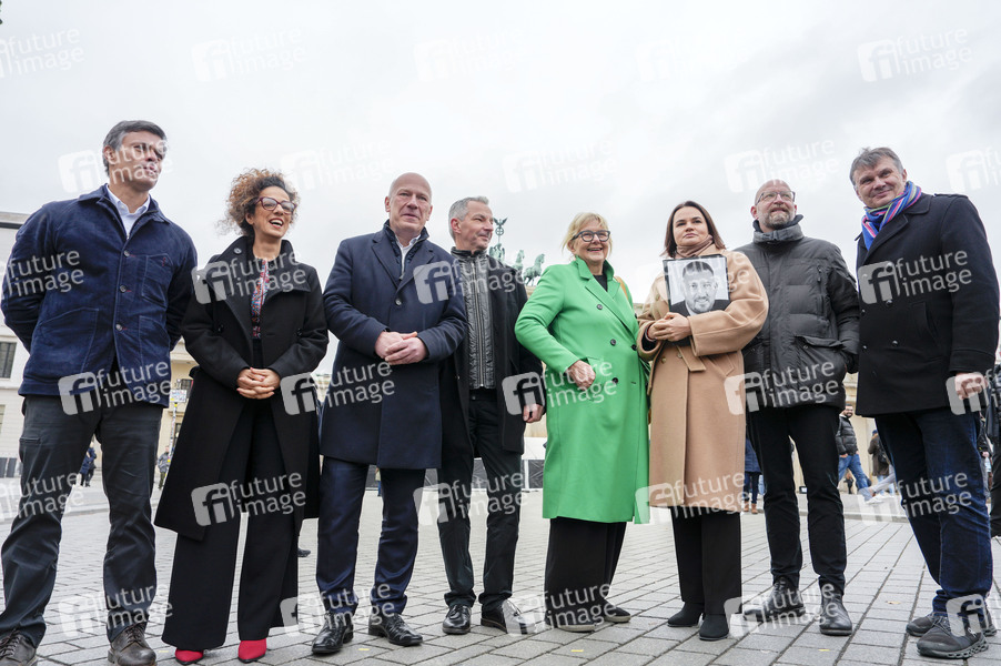 Leopoldo Lopez, Masih Alinejad, Kai Wegner, Frank Ebert, Marianne Birthler und Swetlana Tichanowskaja mit Bürgerrechtlern am Brandenburger Tor aus Anlass des 35. Jahrestags der friedlichenen Revolution und des Mauerfalls. Berlin, 08.11.2024