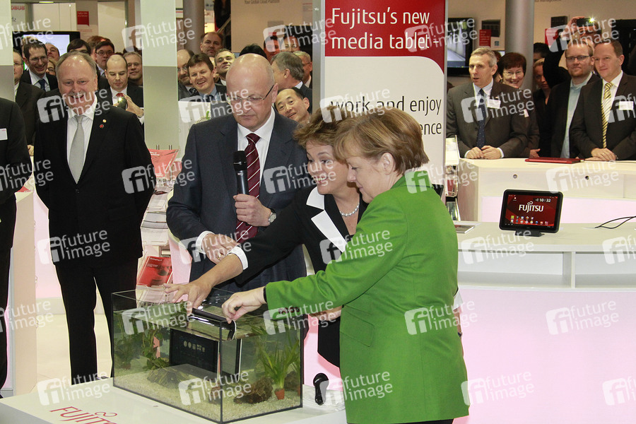 Eröffnungsrundgang von Bundeskanzlerin Merkel auf der CeBIT 2012 (Centrum der Büro- und Informationstechnik), der weltgrößten Messe für Informations- und Computertechnik auf dem Messegelände, Hannover - Am Messestand von Fujitsu versenkt Merkel ein wasserdichtes Tablet