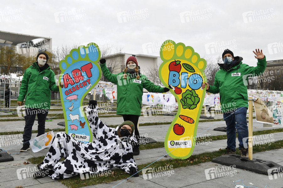 Landwirte, Klima- und Tierschützer demonstrieren unter dem Motto 'Wir haben es satt' für eine Wende in der Agrarpolitik. Vor dem Kanzleramt wird symbolisch mit rund zehntausend Fußabdrücken auf Papier eine bäuerliche, ökologische und klimafreundliche Landwirtschaft gefordert. Berlin, 16.01.2021
