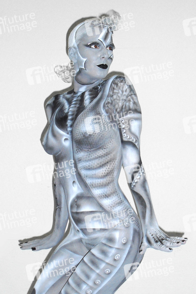 Bodypainting, Erotik, Frau, nackt, drinnen, weiblich, Monster, Außerirdische, Alien, Metall, Körperkunst, Kunst, Malerei, monochrom, erotic, woman, nude, indoor, female, monochrome, body art, body painting, metal