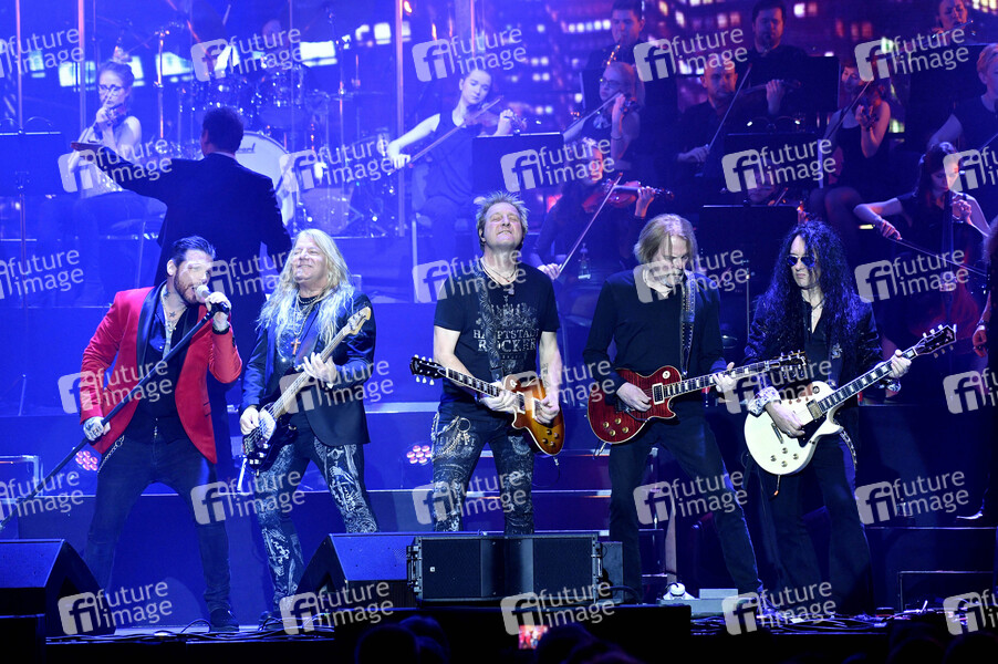 Mat Sinner, Tom Naumann und Alex Beyrodt von The Mat Sinner Band und Ricky Warwick und Scott Gorham von Thin Lizzy und das RMC Symphony Orchestra beim Rock Meets Classic Konzert 2019 im Tempodrom. Berlin, 10.03.2019