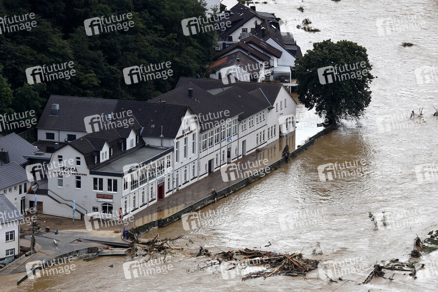 In der Eifel haben heftige Regenfälle und Dauerregen für Überschwemmungen und Überflutungen gesorgt. Im Ahrtal trat der Fluss vielerorts über die Ufer und überschwemmte nicht nur Keller sondern ganze Ortschaften. Im Bild der Ort Dernau (Landkreis Ahrweiler), der beinahe komplett von den Wassermassen geflutet wurde. Viele Menschen verloren alles. Dernau, 15.07.2021