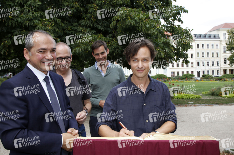 Octavian Ursu, Dominik Graf, Felix von Boehm und Tom Schilling beim Eintrag ins Goldene Buch der Stadt Görlitz und beim Setbesuch zum Kinofilm 'Fabian - Der Gang vor die Hunde' am Wilhelmsplatz. Görlitz, 09.08.2019
