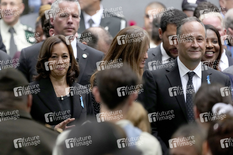Kamala Harris mit Ehemann Douglas Emhoff bei der Gedenkfeier für die Opfer der Terroranschläge vor 21 Jahren am 9/11 Memorial. Mit Schweigeminuten und der Verlesung der Namen der fast 3000 Todesopfer haben die USA am Sonntag an die Terroranschläge vom 11. September 2001 erinnert. Am früheren Standort des World Trade Centers in New York verlasen Angehörige wie jedes Jahr am 11. September die Namen aller Anschlagsopfer. New York, 11.09.2022
