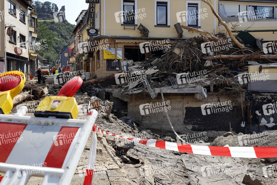 Nach dem Jahrhunderthochwasser in der Eifel durch heftige Regenfälle und Dauerregen mit Überschwemmungen und Überflutungen haben die Aufräumarbeiten im Ahrtal begonnen. Einheiten von Polizei, THW, Bundeswehr und Feuerwehr mitsamt vielen freiwilligen Helfern räumen Straßen, entfernen Schutt und Schlamm und versorgen die Menschen. Im Bild zerstörte Häuser in der Ortschaft Altenahr, in der die Flut viele Häuser zerstörte, 22.07.2021