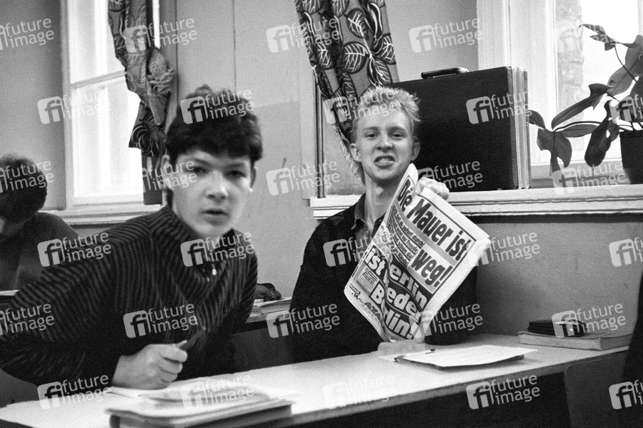 DDR, Wende, Wendezeit, friedliche Revolution, Mauerfall, Mauer, Maueröffnung, Grenzöffnung, Grenze, Schule, Schüler, Jugenliche, Zeitung, Zeitungen, Wiedervereinigung, Freude, Zeitgeschichte, Zeitgeschehen