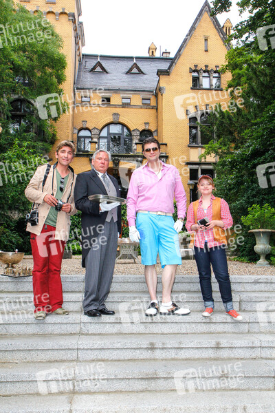 Guido Hammesfahr, Butler, Lutz van der Horst und Geraldine Raths am Set der ZDF Produktion 'Löwenzahn und der glücklichste Mann der Welt'. Berlin, 29.06.2013