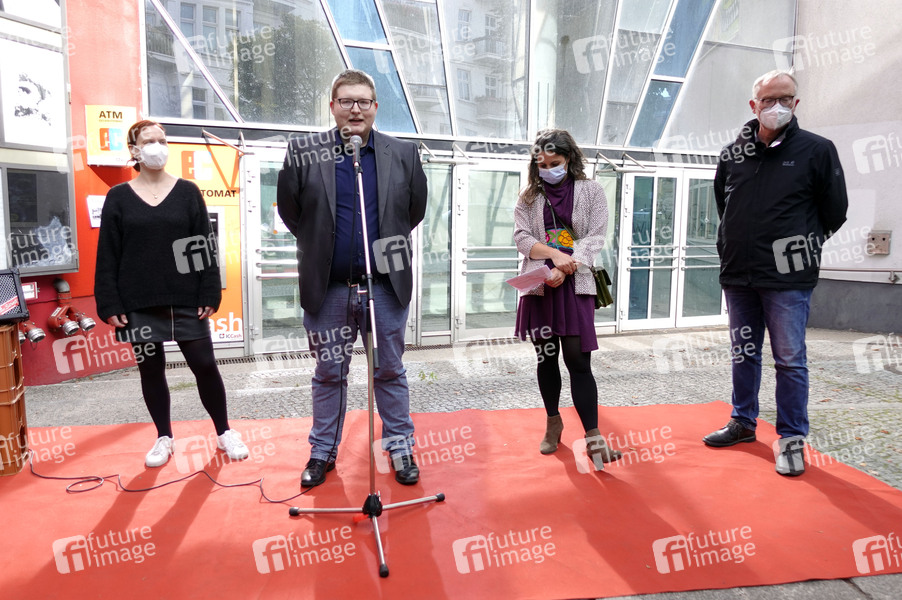 Michel Rieck, Linda Vierecke und Klaus Mindrup bei der Pressekonferenz zum Erhalt des Kino Colosseums im Foyer vom Kino Colosseum. Berlin, 21.09.2021