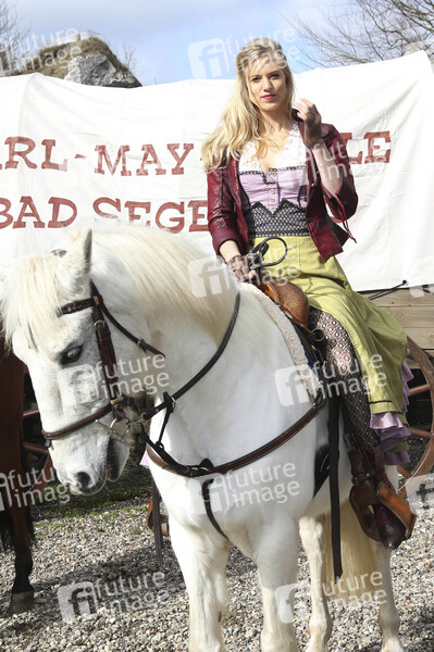 Schauspielerin, Prominenz, Fototermin, Pressetermin, Photocall, Fotocall, Unterhaltung, Entertainment, Kultur, Western, Freilichtbühne, Freilichttheater, Freilufttheater, Kalkbergstadion, Open Air Theater, 68. Karl-May-Spiele 2019, Unter Geiern - Der Sohn des Bärenjägers, Tier, Pferd