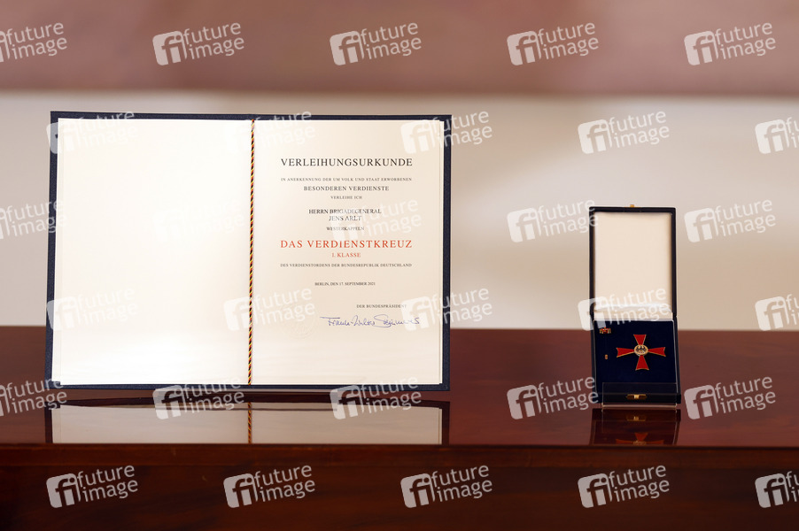 Verleihung des Verdienstkreuzes 1. Klasse an Brigadegeneral Jens Arlt im Schloss Bellevue. Berlin, 17.09.2021
