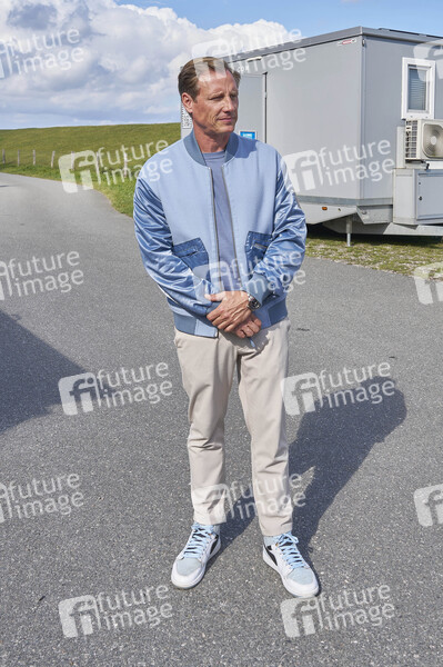 Patrick Kalupa als Dr. Moritz Neiss bei Dreharbeiten zur ZDF-Fernsehserie 'Dr. Nice' am Leuchtturm Falshöft. Pommerby, 11.09.2025