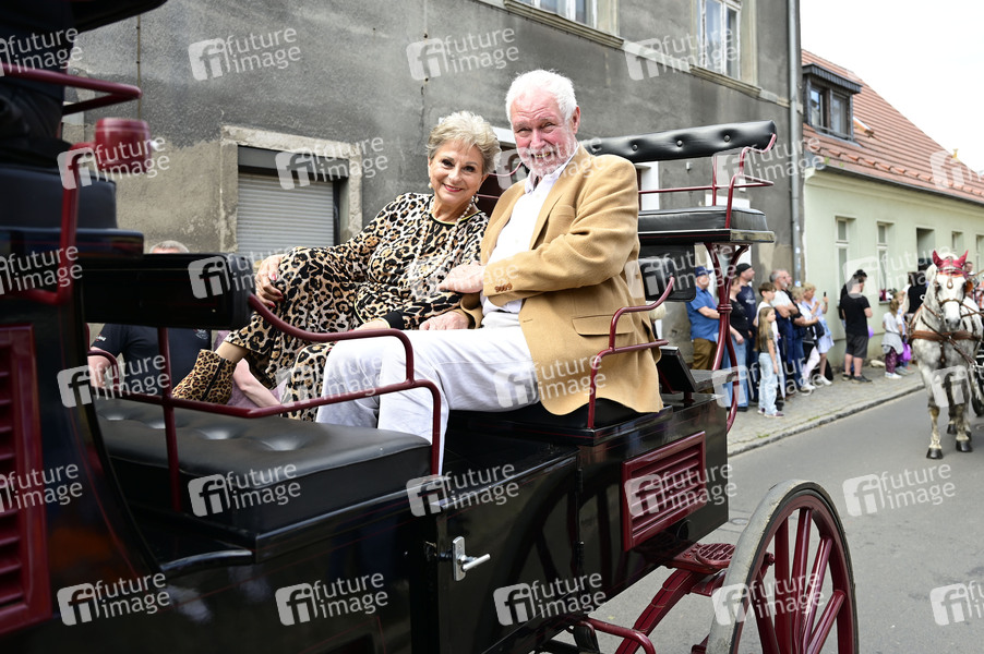 Dagmar Frederic mit Ehemann Klaus Lenk beim Festumzug beim Beelitzer Spargelfest 2025. Beelitz, 01.06.2025