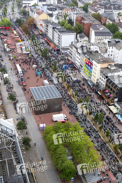 Motorrad-Demo auf der Reeperbahn. Tausende Motorradfahrerinnen und -fahrer haben am Sonnabendnachmittag auf St. Pauli gegen drohende Fahrverbote protestiert. Anlass für die Aktion war eine Initiative des Bundesrats zur Reduzierung von Motorradlärm. Die Länderkammer spricht sich unter anderem dafür aus, für Motorräder leichter Fahrverbote aus Lärmschutzgründen an Sonn- und Feiertagen zu ermöglichen. Außerdem sieht die Initiative vor, dass die Lautstärke neuer Maschinen auf maximal 80 Dezibel begrenzt werden soll. Hamburg, 04.07.2020