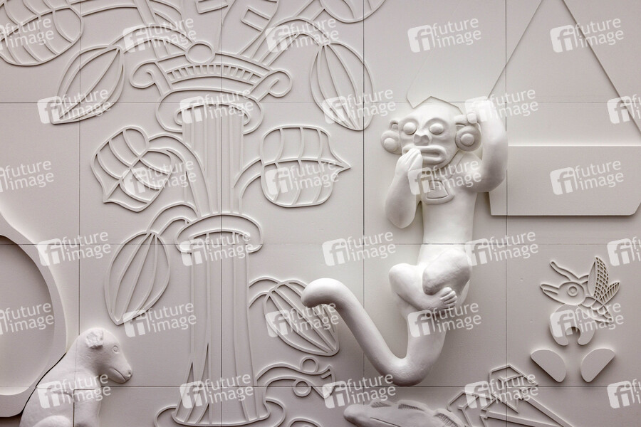 Das neu Wandbild von Minerva Cuevas bei einem Pressetermin zur Vorstellung ihres Werkes, welches sie anlässlich der dritten Ausgabe der Reihe Schultze Projects speziell für die große Stirnwand im Treppenhaus des Museum Ludwig geschaffen hat. Die großformatige Arbeit soll an das Ehepaar Bernard Schultze und Ursula Schultze-Bluhm erinnern, deren Nachlass das Museum Ludwig verwaltet. Köln, 5.11.2021