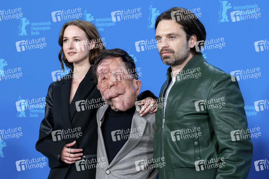 Renate Reinsve, Adam Pearson und Sebastian Stan beim Photocall zum Kinofilm 'A Different Man' auf der Berlinale 2024 / 74. Internationale Filmfestspiele Berlin im Hotel Grand Hyatt. Berlin, 16.02.2024