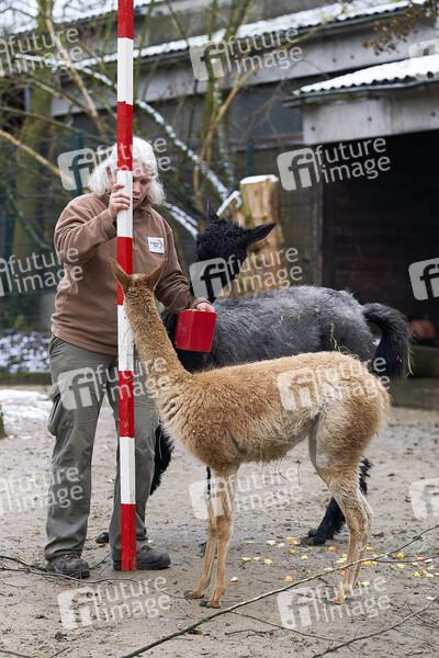 Sylvia Nietfeld mit Vikunja und Alpaka bei der Inventur zum Jahresbeginn 2021 im Erlebnis-Zoo Hannover. Hannover, 14.01.2021