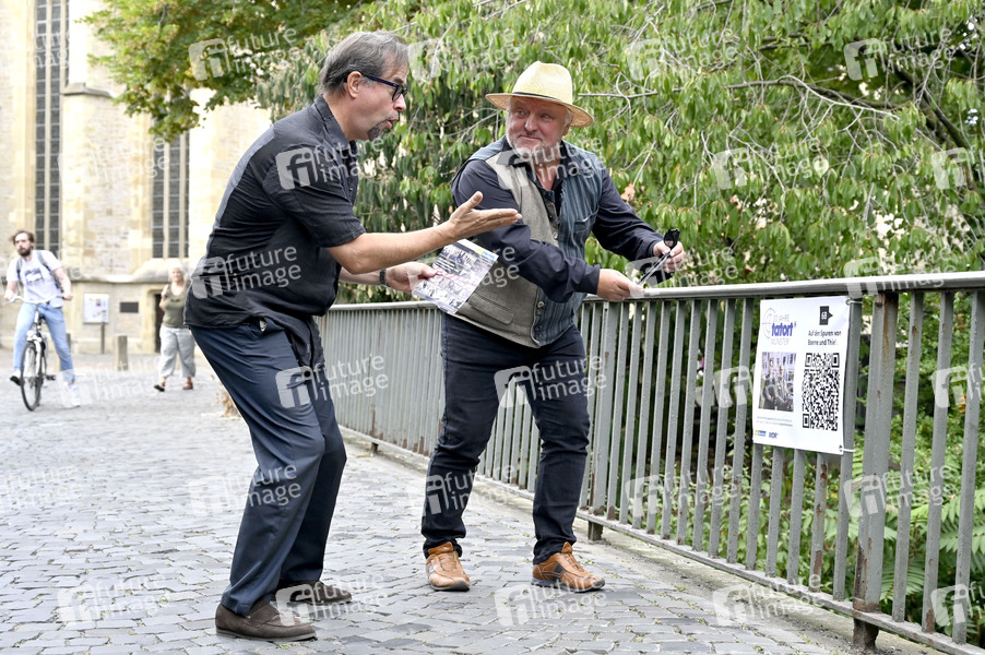 Jan Josef Liefers und Axel Prahl beim Presserundgang 'Spurensuche Tatort Münster' an original Drehorten mit dem Tatort-Cast zum 20 jährigen Jubiläum des Münsteraner Tatorts. Münster, 30.08.2022
