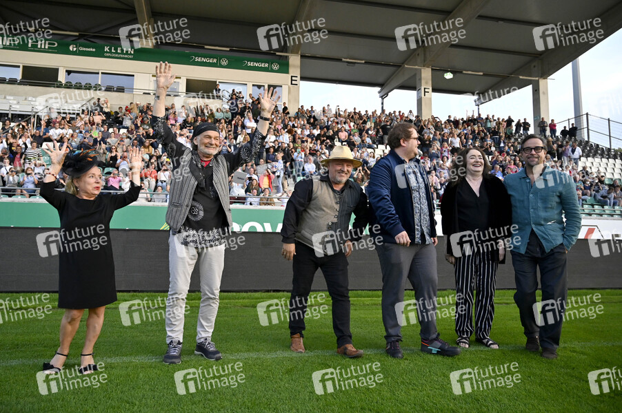 ChrisTine Urspruch, Claus Dieter Clausnitzer, Axel Prahl, Björn Meyer, Mechthild Großmann und Jan Josef Liefers bei der Premiere des ARD-Krimis 'Tatort - Ein Freund, ein guter Freund' zum 20 jährigen Jubiläum des Münsteraner Tatorts im Preußenstadion. Münster, 30.08.2022