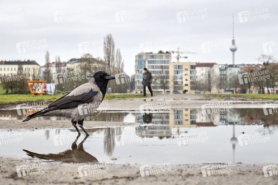 Dauerregen, Fauna, Fernsehturm, Jahreszeit, Krähe, Krähen, Landschaft, Nebelkrähe, Park, Parklandschaft, Parks, Pfütze, Pfützen, Regen, Regenpfütze, Regenschauer, Regenwetter, regnen, regnerisch, Sehenswürdigkeit, Spiegelung, Stadt, Stadtansichten, Städte, Stadtlandschaft, Stadtpark, Symbolbild, Symbolfoto, Themenbild, Tier, Vogel, Vögel, Wahrzeichen, Wasserpfütze, Wetter, Wetterbild, Winter