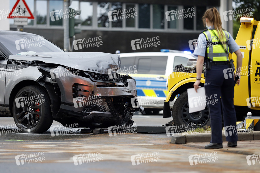 Zwei SUV sind nach einem Unfall auf der Aachener Straße schwer beschädigt. Die Polizei sperrt die Fahrbahn und sichert die Unfallstelle. Nach Zahlen des Statistischen Bundesamtes Wiesbaden (Destatis) sind in Deutschland im April 2021 184 Menschen bei Straßenverkehrsunfällen ums Leben gekommen - so wenige wie noch nie in einem April seit der deutschen Vereinigung. (Themenbild, Symbolbild) Köln, 04.07.2021