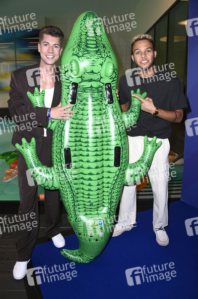 Maximilian Seitz und Malik Harris beim Charity Promi Swim Event 2025 von Maximilian Seitz zugunsten von 'Kindeswohl-Berlin' im Hotel Pullman Berlin Schweizerhof. Berlin, 24.07.2025