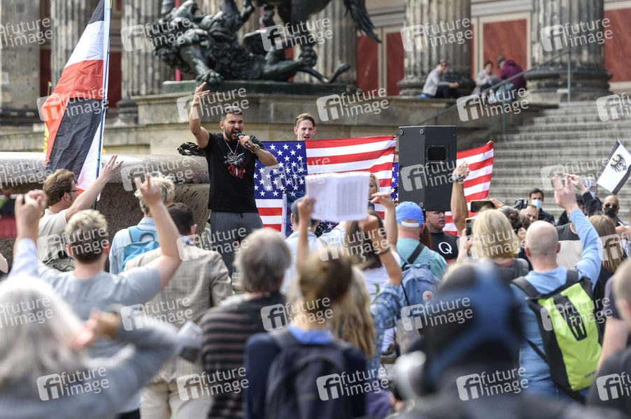 Vegan-Koch Attila Hildmann spricht bei einer Kundgebung nach einem Autokorso durch Berlin vor dem Alten Museum vor Reichsbürgern, Rechtsradikalen und Verschwörungtheoretikern. Der Protest richtet sich gegen die bestehenden Corona-Beschränkungen. Mit einem Transparent distanziert sich das Alte Museum. Berlin, 11.07.2020