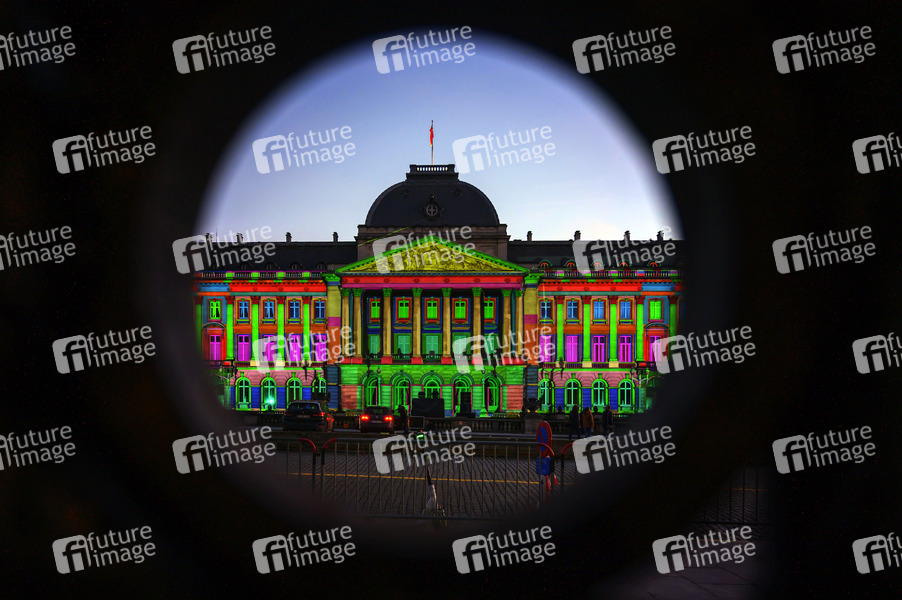Der Königliche Palast beleuchtet mit bder Videokunst Performance 'Chiaroscuro - Dirty Monitor' im Rahmen des Events 'Bright Brussels'. Brüssel, 27.10.2021