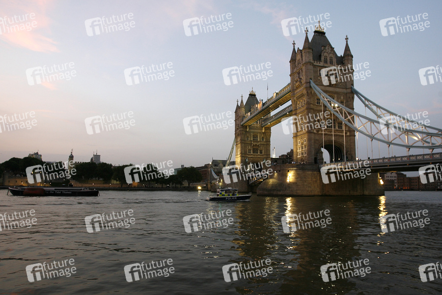 Klappbrücke, Neugotik, 244 Meter lang, Höhe der Brückentürme 65 Meter, die Fahrbahn zwischen den 61 Meter voneinander entfernten Türmen liegt neun Meter über dem Fluss, Fußgängerbrücke in 43 Meter Höhe, die beiden Baskülen können bis zu einem Winkel von 83 Grad hochgeklappt werden, Architekt Horace Jones, erbaut 1886 bis 1894, Themse, Nachtaufnahme, Tower of London