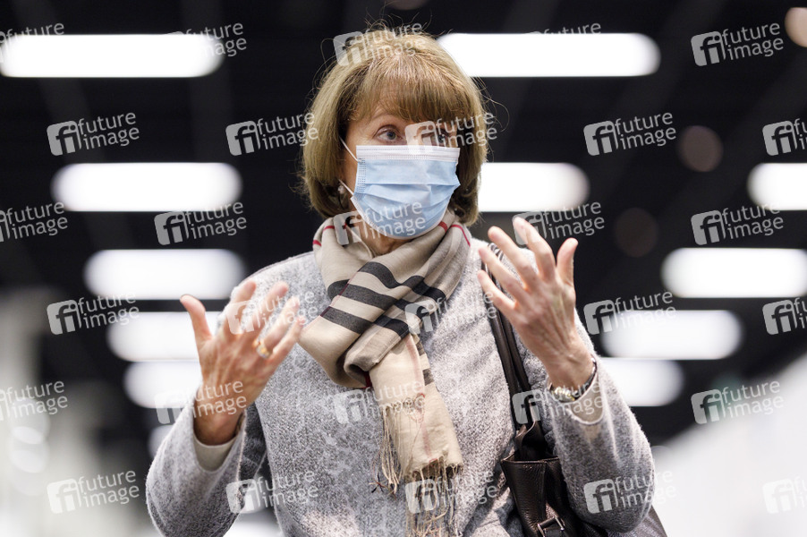 Henrietter Reker auf der Pressekonferenz: Der NRW-Justizminister auf Werbetour in Köln für die Kampagne des Weissen Rings zum Thema 'Kein Anschluss für Betrüger am Telefon' im Impfzentrum in den Messehallen. Auch dort sollen Plakate die alten Menschen vor der Enkeltrick-Masche warnen, die ohnehin die Messehallen für einen Impftermin aufsuchen. Köln, 05.02.2021