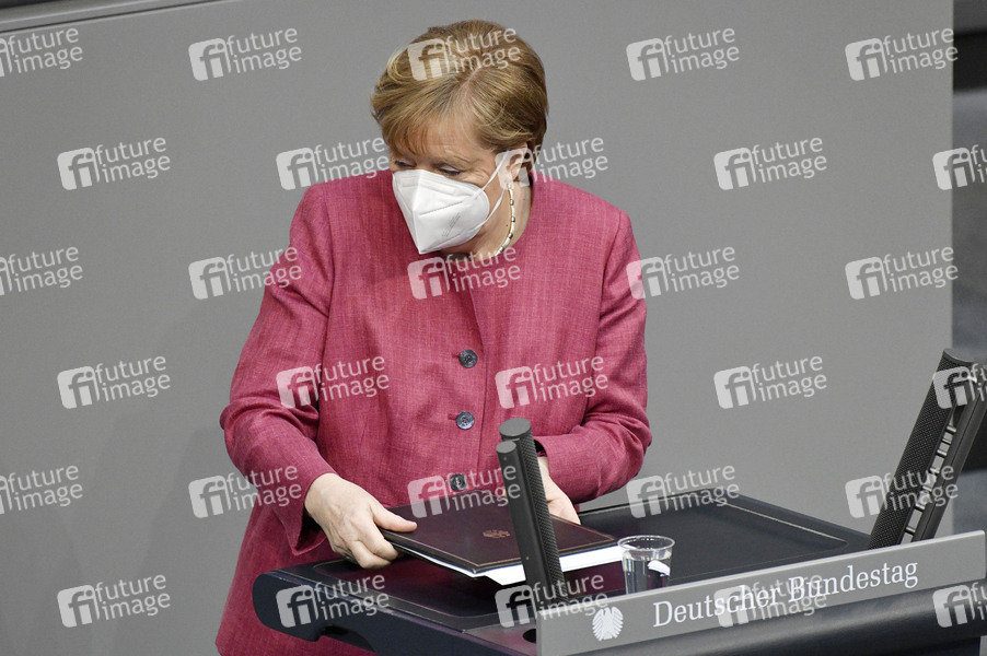 Angela Merkel in der 222. Sitzung des Deutschen Bundestages im Reichstagsgebäude. Berlin, 16.04.2021