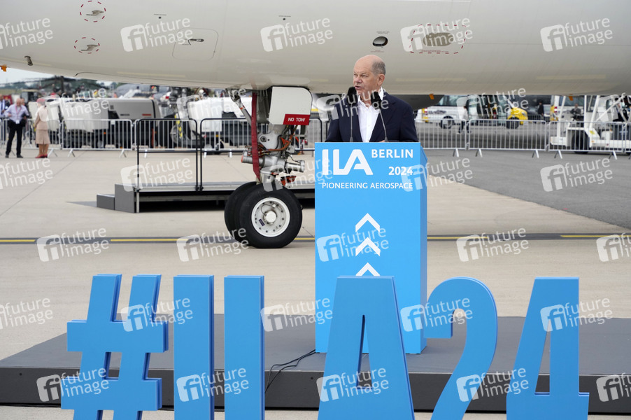 Olaf Scholz vor einem Airbus A321 beim Eröffnungsrundgang der ILA Berlin auf dem ILA-Gelände am Flughafen BER Berlin-Brandenburg. Berlin, 05.06.2024
