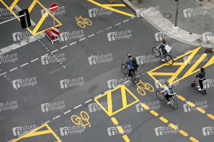 Bis Januar 2021 dürfen zwischen Französischer Straße und Leipziger Straße keine Autos auf der Friedrichstraße fahren - aber Radfahrer. Sie bekommen eine vier Meter breite Spur, die noch grün unterlegt werden soll, sie soll auch als Gasse für Rettungswagen dienen. Es gilt das Tempolimit 20 für Radfahrer. Das Projekt ist Teil des mehrmonatigen Tests 'Flaniermeile Friedrichstraße'. Berlin, 01.09.2020