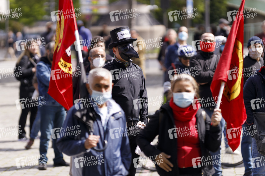 Demo, Demonstranten, Demonstration, Erster Mai, Feiertag, Maidemo, Mai-Demo, Politik, Protestplakat, Tag der Arbeit, Corona, Sars-CoV-2, Covid-19, Coronavirus, Coronaviren, Corona-Virus, Coronakrise, Corona-Krise, Corona-Pandemie, Coronamaßnahmen, Corona-Schutz, flatten the curve, Ausnahmesituation, Atemschutz, Atemschutzmaske, Virenschutz, Schutzmaske, Schutzmasken, Atemschutzmasken, Maske, Masken, Mundschutz, Mund-Schutz, Mundschutzpflicht, Maskenpflicht, Mundschutz-Pflicht, Mund-Nase-Schutz, Mund-Nasen-Schutz, MNS, Vermummung, Kontaktverbot, Versammlungsverbot, Mindestabstand, Social Distancing, Kontakt verboten, Ausgangsbeschränkung, Abstand, Abstandhalten, Abstandsregel, Abstandsregeln, Allgemeinverfügung