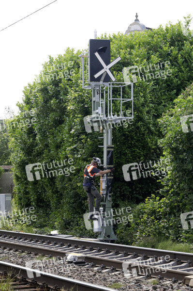 Bahnmitarbeiter bei der Signalinstallation beim Fototermin 'Helikopter fliegt Signalmaste für das neue Elektronische Stellwerk in Bonn-Beuel ein'. Es beginnt letzte große Bauphase vor der Generalsanierung der rechten Rheinstrecke im Jahr 2026. Mit Hilfe eines Helikopters werden knapp 50 Signalmaste für das neue ESTW Bonn-Beuel eingeflogen. Bonn, 14.06.2025
