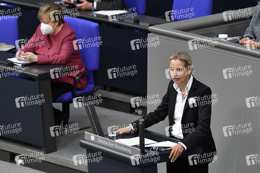 Angela Merkel und Alice Weidel in der 222. Sitzung des Deutschen Bundestages im Reichstagsgebäude. Berlin, 16.04.2021