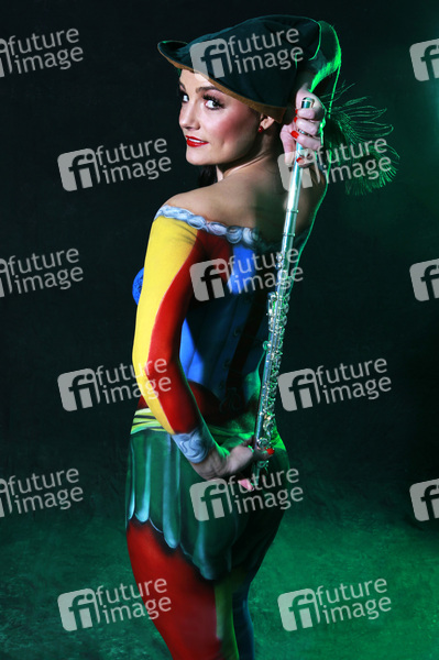 Bodypainting, Erotik, Frau, Mädchen, nackt, drinnen, weiblich, Körperkunst, Kunst, Malerei, Flöte, erotic, woman, girl, nude, indoor, female, body art, body painting, flute