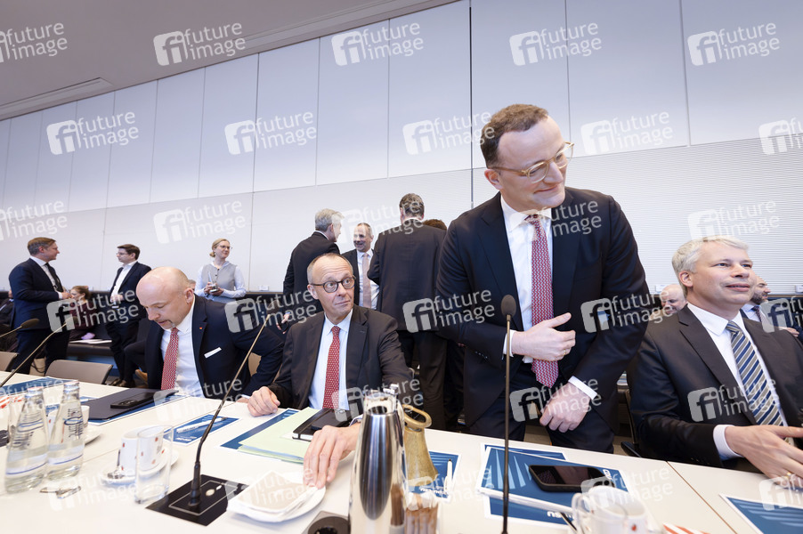 Alexander Hoffmann, Friedrich Merz und Jens Spahn in der Fraktionssitzung der CDU/CSU-Bundestagsfraktion im Reichstagsgebäude. Berlin, 17.03.2026