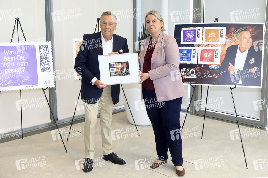 Roland Kaiser und Nikola Hagleitner bei der Vorstellung der Roland Kaiser-Briefmarken. Anlässlich seines Bühnenjubiläums 'RK50 I 50 Jahre – 50 Hits' ehrt die Deutsche Post den erfolgreichsten Interpreten im Schlagergenre, Roland Kaiser, mit eigenen Briefmarken. Deutsche Post Zentrale, Post Tower. Bonn, 11.07.2024